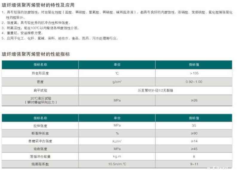 FRPP管的制造工艺及技术:FRPP管管采用无规共聚聚丙烯作为原料,过去产品原料只能通过进口,国内尚无生产能力,所以FRPP管道一直存在着质优价高的问题。FRPP管材是采用带有混炼段的FRPP管专用螺杆和FRPP管专用挤出模头的单螺杆挤出机,经挤出成型工艺生产的管材;FRPP管件是采用与FRPP管材相同牌号的专用料,经注塑成型工艺生产。FRPP管除具有普通塑料管的无锈蚀性、不结垢、流阻小,加工能耗低等特殊性外,还具有使用寿命长,低温抗冲击性能好,耐高温和良好的热熔焊接性能。其技术性能特点如下:(1)重量轻(仅为金属管的1/8)施工强度低、搬运方便。(2}采用热熔连接:管材、管件同质熔化为同一整体,使用寿命长,安全可靠,永不渗漏。(3)保温节能:FRPP管导热系数为0.21W(m.K),仅为钢管导热系数的1/200,用于热水管道保温节能效果明显。